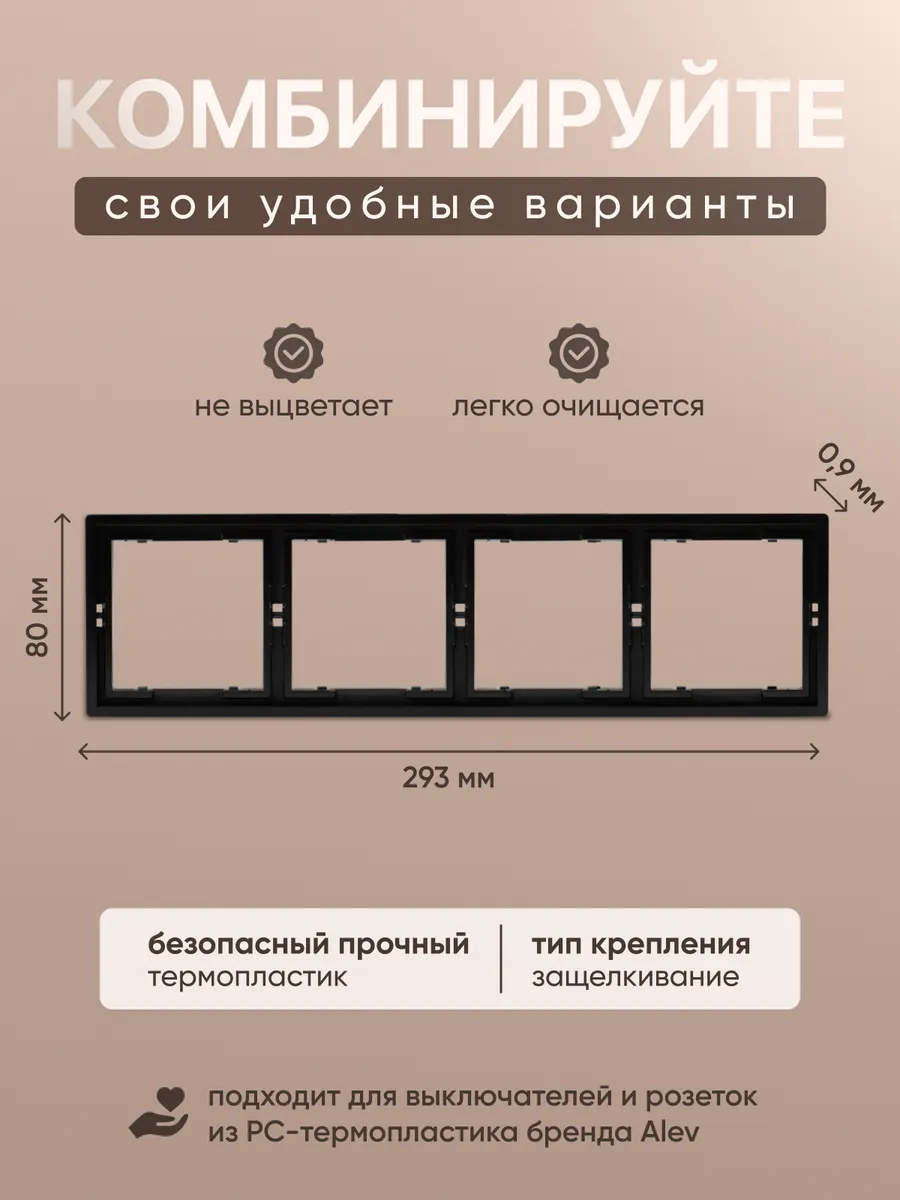 Представляем вам четверную рамку бренда ALEV серия Basic размером 293 мм на 80 мм, предназначенную для установки розеток и выключателей. Рамка четырехпостовая имеет горизонтальную ориентацию. Рамка четырехместная изготовлена из термопластика, что обеспечивает надежность и безопасность в использовании. Представлена в трех цветах: серый, белый и черный. Рамки для выключателей и розеток из термопластика бренда ALEV сочетаются между собой, их можно комбинировать для создания уникального решения. Рамка черная отлично впишется в любой интерьер и подходит для использования в любых помещениях, включая квартиры, дома и офисы. Легко очищается с помощью влажной салфетки, не выцветает и стильно смотрится. Накладка на розетку и выключатель легко устанавливается с помощью защелкивания и может быть использована как при новой установке, так и при ремонте. Рамка от ALEV - это выбор для тех, кто ищет качественную и стильную рамку для установки электротоваров.
