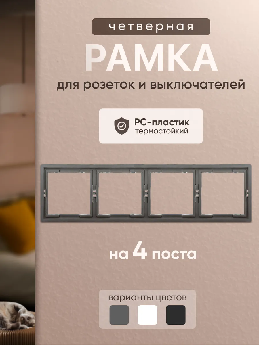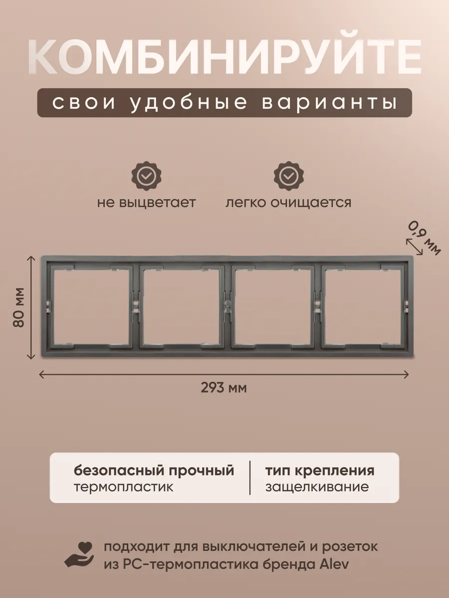 Представляем вам четверную рамку бренда ALEV серия Basic размером 293 мм на 80 мм, предназначенную для установки розеток и выключателей. Рамка четырехпостовая имеет горизонтальную ориентацию. Рамка четырехместная изготовлена из термопластика, что обеспечивает надежность и безопасность в использовании. Представлена в трех цветах: серый, белый и черный. Рамки для выключателей и розеток из термопластика бренда ALEV сочетаются между собой, их можно комбинировать для создания уникального решения. Рамка серая отлично впишется в любой интерьер и подходит для использования в любых помещениях, включая квартиры, дома и офисы. Легко очищается с помощью влажной салфетки, не выцветает и стильно смотрится. Накладка на розетку и выключатель легко устанавливается с помощью защелкивания и может быть использована как при новой установке, так и при ремонте. Рамка от ALEV - это выбор для тех, кто ищет качественную и стильную рамку для установки электротоваров.