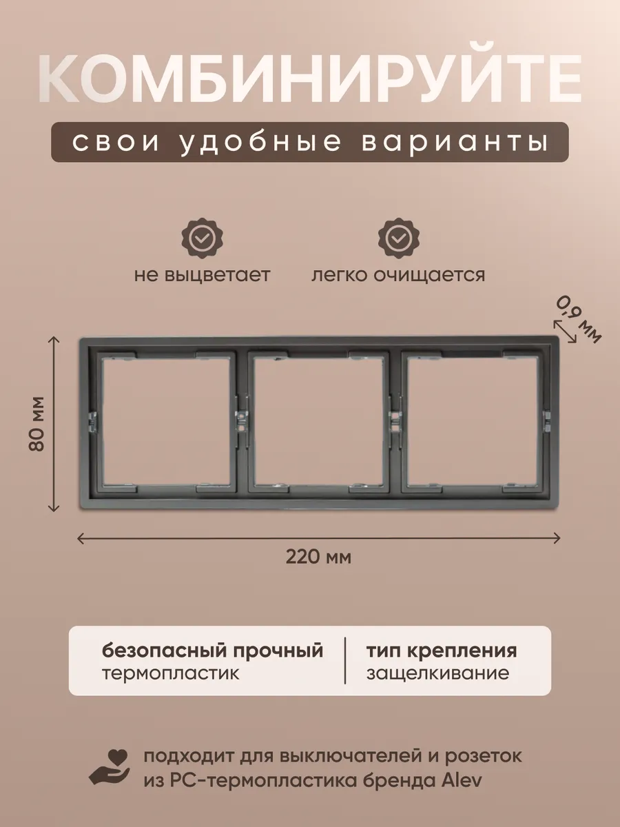 Представляем вам тройную рамку бренда ALEV серия Basic размером 220 мм на 80 мм, предназначенную для установки розеток и выключателей. Рамка трехпостовая имеет горизонтальную ориентацию. Рамка трехместная изготовлена из термопластика, что обеспечивает надежность и безопасность в использовании. Представлена в трех цветах: серый, белый и черный. Рамки для выключателей и розеток из термопластика бренда ALEV сочетаются между собой, их можно комбинировать для создания уникального решения. Рамка серая отлично впишется в любой интерьер и подходит для использования в любых помещениях, включая квартиры, дома и офисы. Легко очищается с помощью влажной салфетки, не выцветает и стильно смотрится. Накладка на розетку и выключатель легко устанавливается с помощью защелкивания и может быть использована как при новой установке, так и при ремонте. Рамка от ALEV - это выбор для тех, кто ищет качественную и стильную рамку для установки электротоваров.