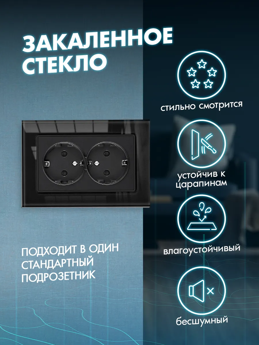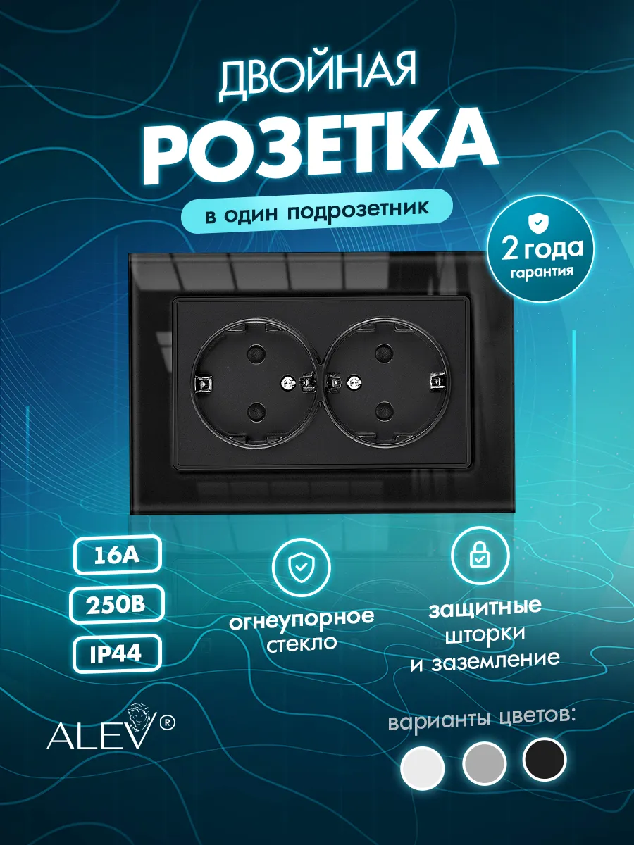 Двойная розетка в один подрозетник из закаленного стекла черная бренда ALEV серия Glass - это эстетичное дополнение интерьера, которое будет радовать вас стильным внешним видом и безупречной функциональностью. Можно поставить вместо одинарной электророзетки без дополнительного сверления и монтажа стен. Сочетающая качество и стиль встраиваемая модель оснащена закрывающими защитными шторками и заземлением для безопасности. Она идеально входит в стандартный настенный подрозетник квадратной или круглой формы (1 шт).