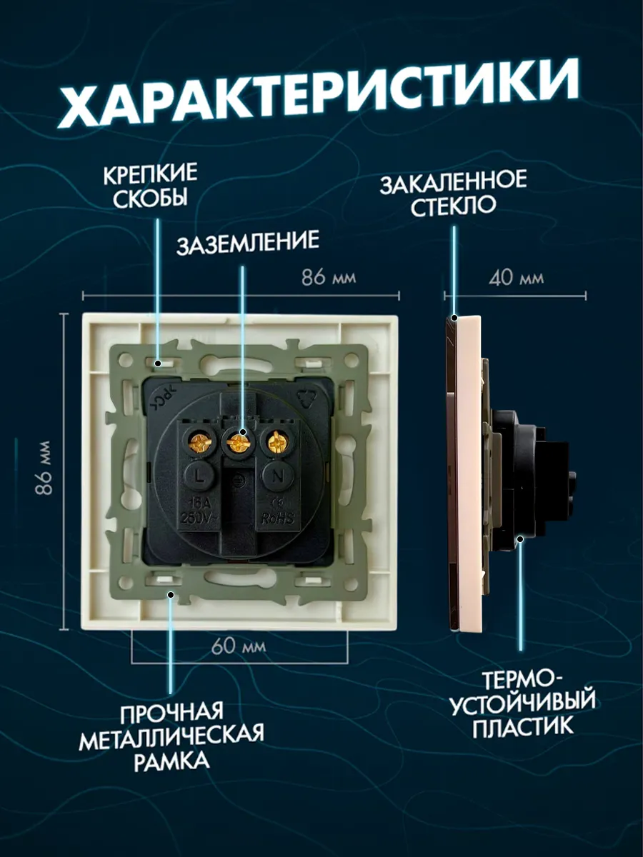 Качественное изделие выполнено длиной 86 мм, высотой 86 мм, глубиной 40 мм. Расстояние между отверстиями для болтов составляет 60 мм (болты идут в комплекте). У устройства напряжение 100-240 В, сила тока 16А, степень защиты: IP44. Такая розетка может устанавливаться в помещениях с повышенной влажностью, будь то кухня или ванная комната. Ее основание выполнено из PC-термоустойчивого пластика в четырех базовых цветах: универсальном белом и лаконичном черном, в приятном оттенке серого окраса и изысканном золотом. Стильный дизайн изделия с ударопрочной стеклянной рамкой гармонично впишется в любой интерьер, будь то лофт или минимализм, скандинавский или прованс, классика, хай-тек или гранж.