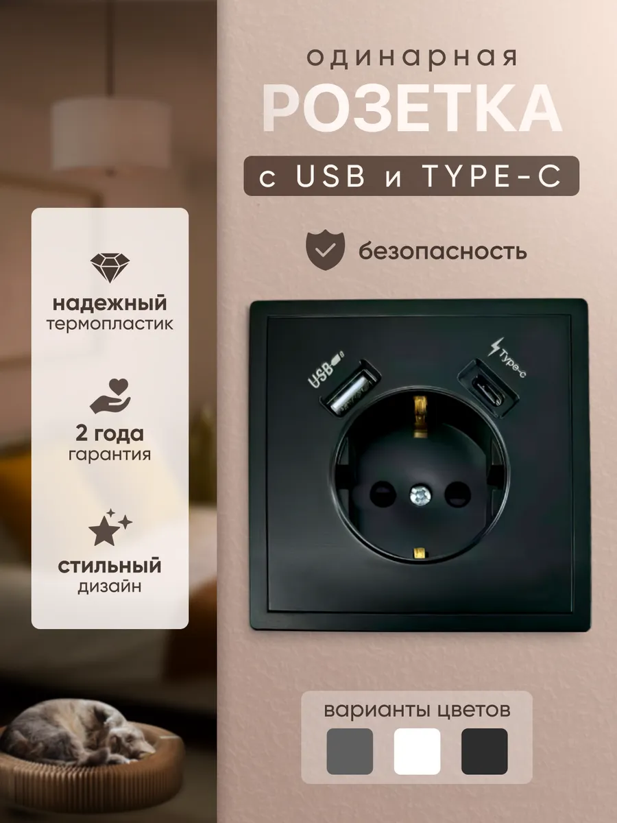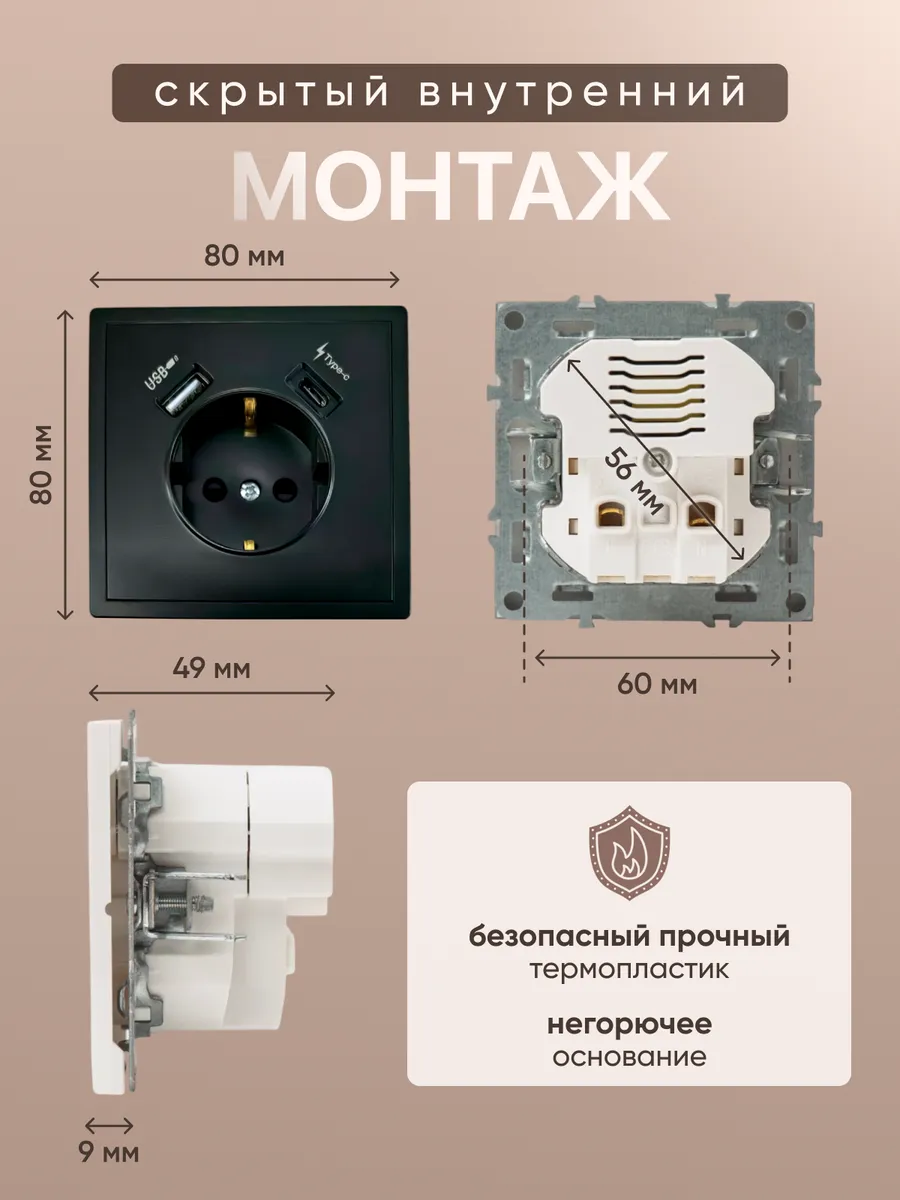 Однопостовая розетка черная бренда ALEV серия Basic - это типовой вариант модуля для простого подключения электроприбора к сети электропитания. Современная модель розетки с USB и Type C на 5 вольт оборудована защитным шторками, выполнена с заземлением. Качественное изделие предназначено для скрытой установки в стандартный круглый подрозетник, а также квадратный. Встроенный механизм со степенью защиты IP21 предназначен для максимального напряжения в 250В и максимальной силы тока в 16А, выполнен с корпусом квадратной формы: высотой 8 см и шириной 8 см, с глубиной 4.9 см. Заземляющий контакт обеспечивает дополнительную защиту от удара электрическим током.