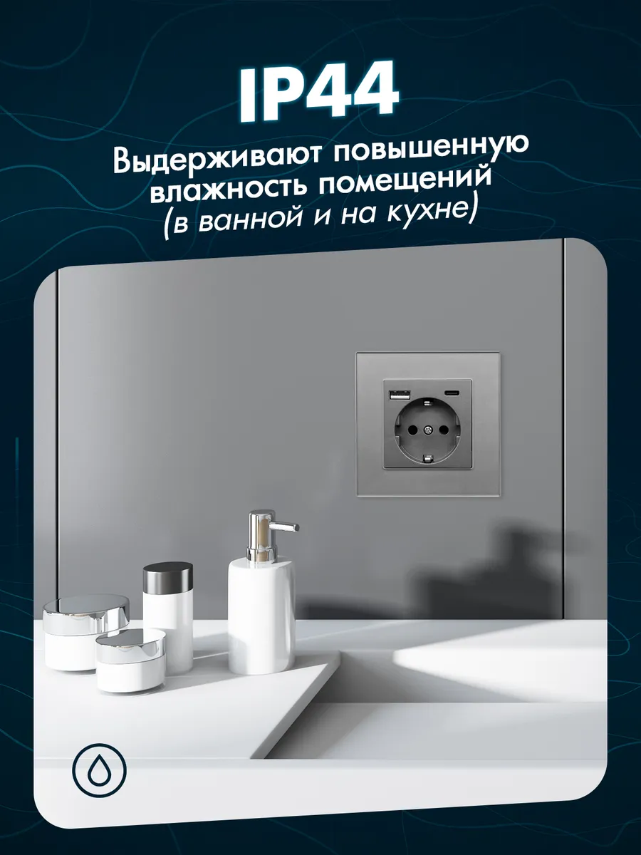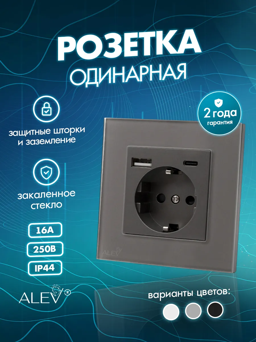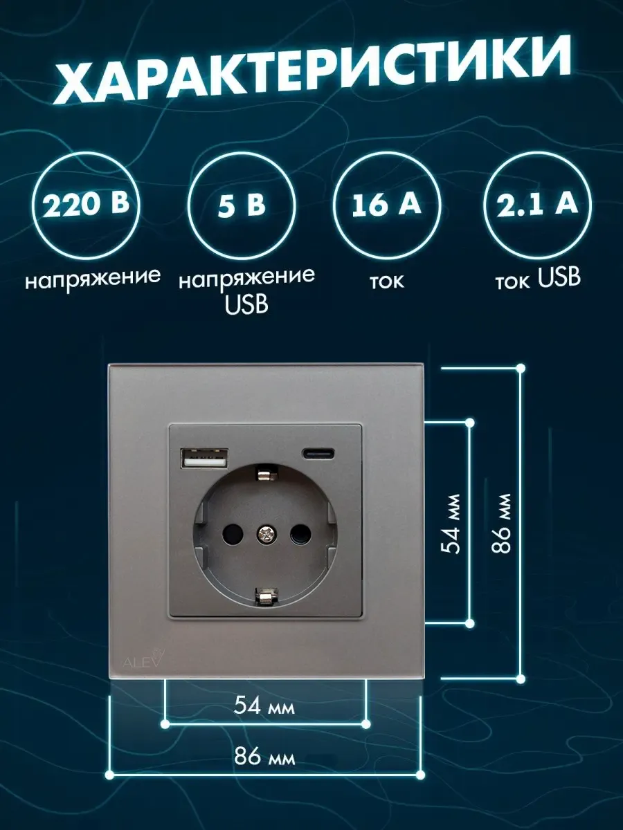 Качественное изделие выполнено длиной 86 мм, высотой 86 мм, глубиной 40 мм. Расстояние между отверстиями для болтов составляет 60 мм (болты идут в комплекте). Разъем Type-C для питания и зарядки электронных устройств. У устройства напряжение 100-240 В, сила тока 16А, USB: 5В/2А, Type-C: 5В/2А, степень защиты: IP44. Такая розетка может устанавливаться в помещениях с повышенной влажностью, будь то кухня или ванная комната. Ее основание выполнено из PC-термоустойчивого пластика в четырех базовых цветах: универсальном белом и лаконичном черном, в приятном оттенке серого окраса и изысканном золотом. Стильный дизайн изделия с ударопрочной стеклянной рамкой гармонично впишется в любой интерьер, будь то лофт или минимализм, скандинавский или прованс, классика, хай-тек или гранж.
