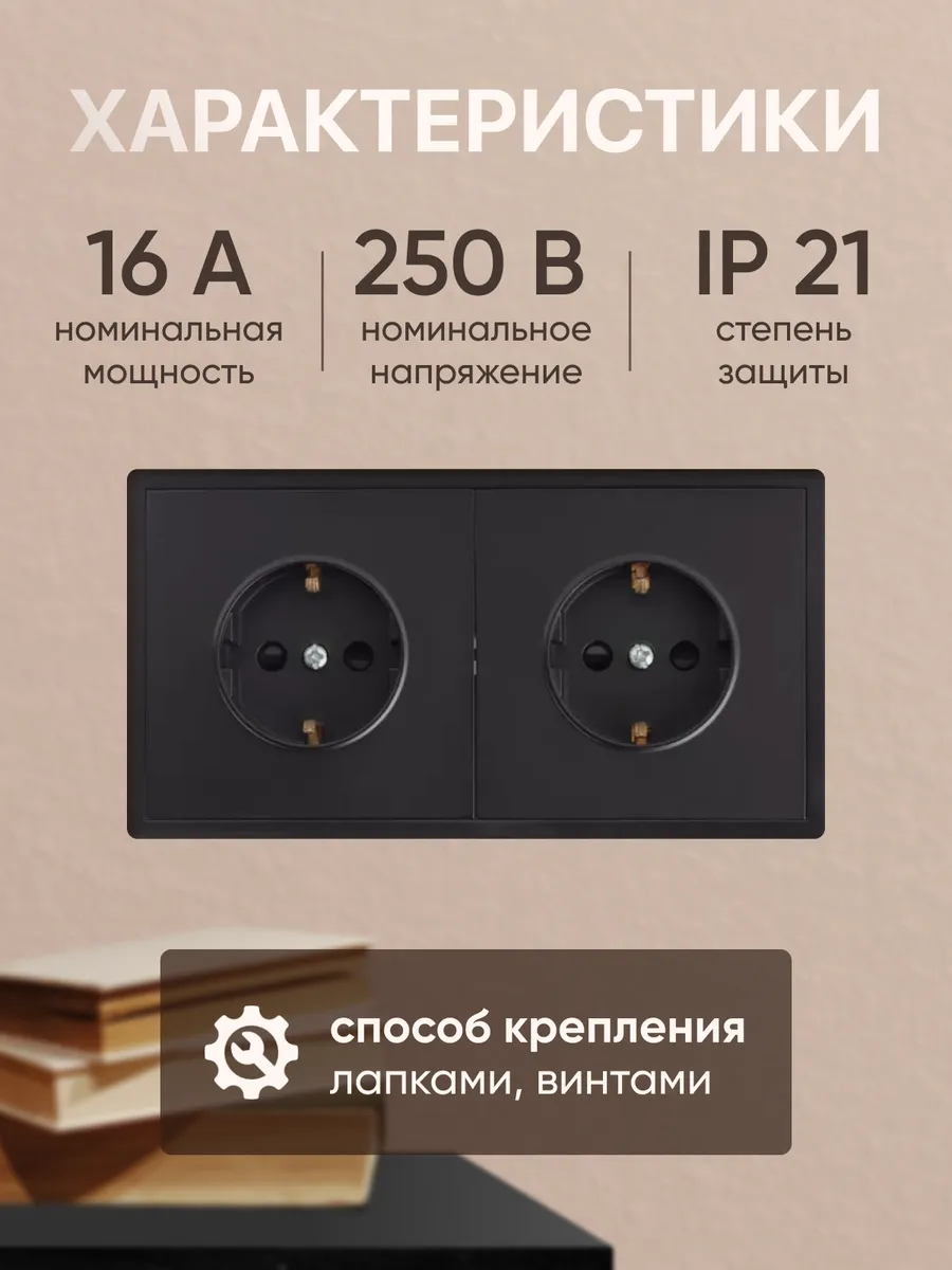 Лицевые детали настенной модели изготовлены из прочного и долговечного термопластика, который устойчив к царапинам и истиранию, к воздействию ультрафиолетового излучения. Универсальная двухместная розетка черного цвета эстетично дополнит интерьер кухни или столовой, коридора или прихожей, ванной или объединенного санузла, зала или гостиной, будет полезна в детской комнате ребенка или подростка, спальне взрослых.