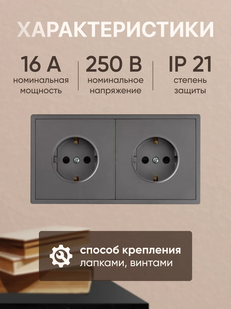 Лицевые детали настенной модели изготовлены из прочного и долговечного термопластика, который устойчив к царапинам и истиранию, к воздействию ультрафиолетового излучения. Универсальная двухместная розетка серого цвета эстетично дополнит интерьер кухни или столовой, коридора или прихожей, ванной или объединенного санузла, зала или гостиной, будет полезна в детской комнате ребенка или подростка, спальне взрослых.
