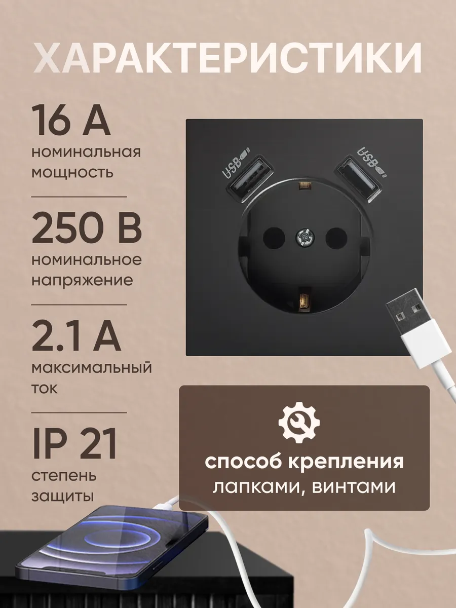 Однопостовая розетка - это типовой вариант модуля для простого подключения электроприбора к сети электропитания. Современная модель розетки с двумя USB на 5 вольт представляет собой интерфейс между электрической проводкой в стене и вилкой прибора. Она оборудована защитным шторками, выполнена с заземлением. Качественное изделие предназначено для скрытой установки в стандартный круглый подрозетник, а также квадратный. Встроенный механизм со степенью защиты IP21 предназначен для напряжения в 250В и силы тока в 16А, выполнен с корпусом квадратной формы: высотой 7 см и шириной 7 см, с глубиной 3.5 см. Заземляющий контакт обеспечивает дополнительную защиту от удара электрическим током.