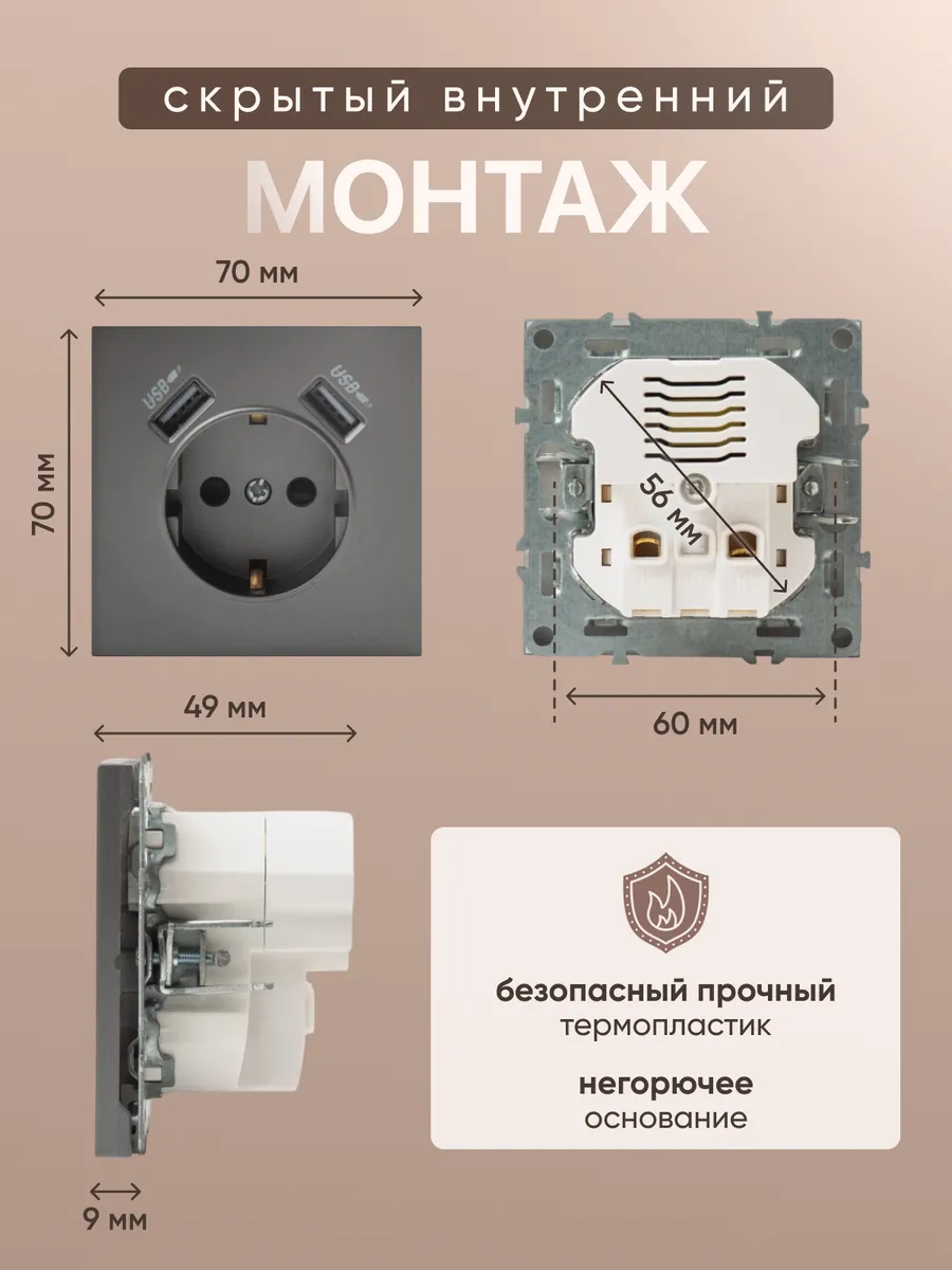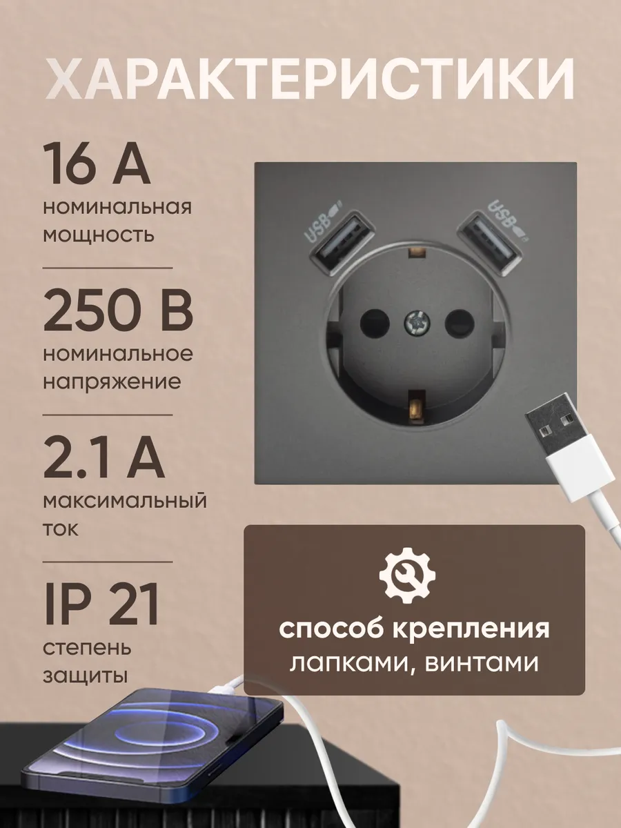 Однопостовая розетка - это типовой вариант модуля для простого подключения электроприбора к сети электропитания. Современная модель розетки с двумя USB на 5 вольт представляет собой интерфейс между электрической проводкой в стене и вилкой прибора. Она оборудована защитным шторками, выполнена с заземлением. Качественное изделие предназначено для скрытой установки в стандартный круглый подрозетник, а также квадратный. Встроенный механизм со степенью защиты IP21 предназначен для напряжения в 250В и силы тока в 16А, выполнен с корпусом квадратной формы: высотой 7 см и шириной 7 см, с глубиной 3.5 см. Заземляющий контакт обеспечивает дополнительную защиту от удара электрическим током.