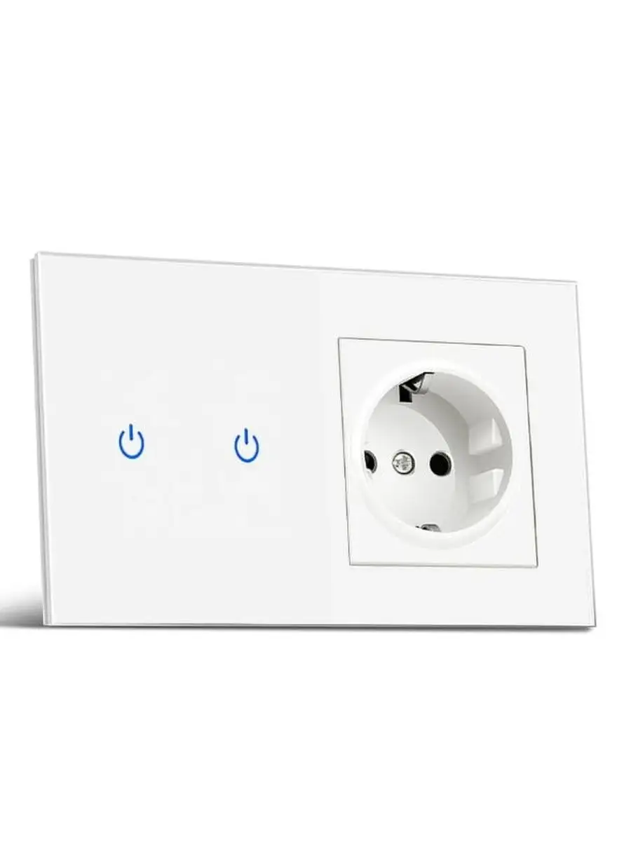 Двухклавишный сенсорный выключатель и одинарная розетка с рамкой из закаленного стекла белая в одном предмете являются стильным и современным устройством для управления освещением. Он идеально подходит для лампы, светильника или светодиодной ленты, благодаря своей надежности и простоте использования. Особенностью данного включателя является наличие чувствительного сенсора, который обеспечивает лёгкость в управлении светом. Это достигается за счет высокого уровня кинетической чувствительности, что позволяет максимально плавно реагировать на касания.