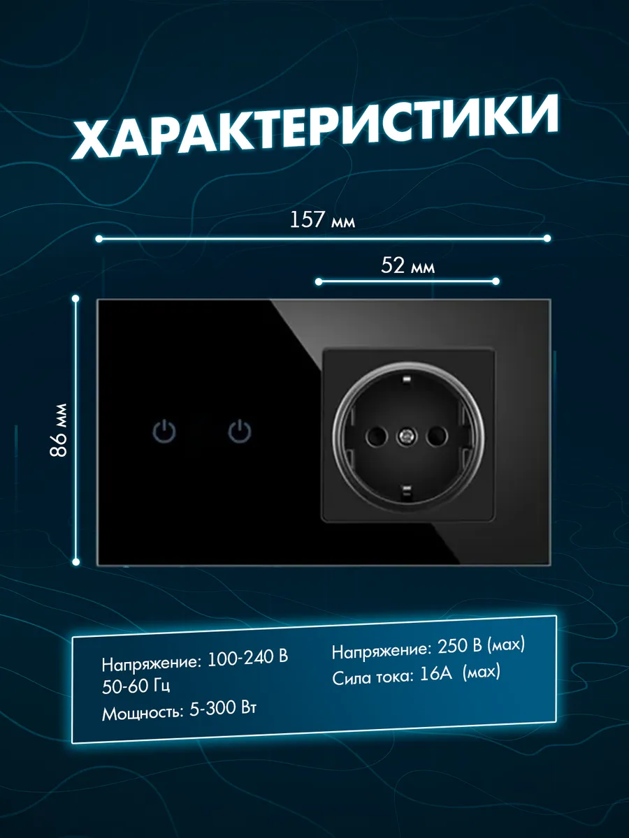 Корпус выключателя и розетки изготовлен из закаленного стекла черного цвета, что гарантирует его долговечность и устойчивость к внешним воздействиям. Использование стеклянного материала обеспечивает не только красивый внешний вид устройства, но и дополнительную защиту от повреждений. Закаленное стекло придаёт изделию прочность и долговечность, а также предотвращает появление царапин.
