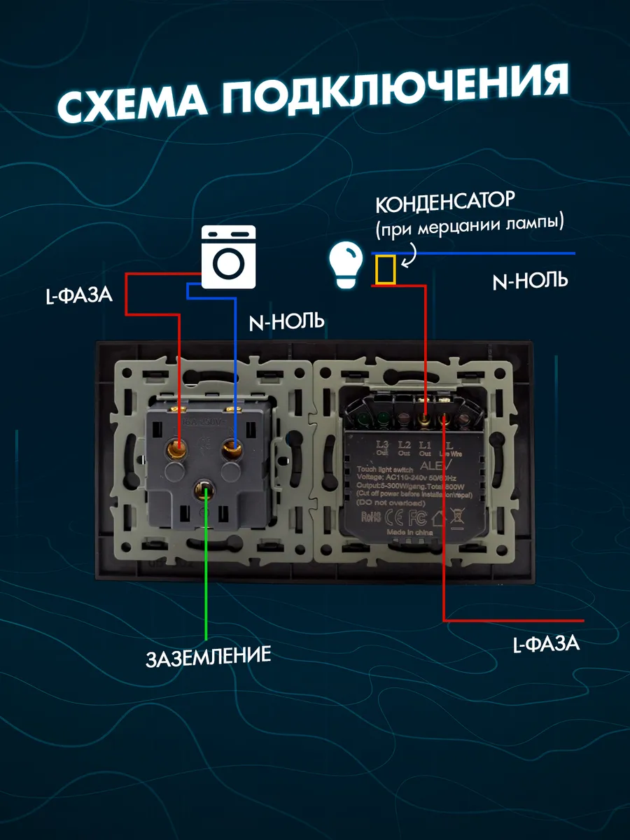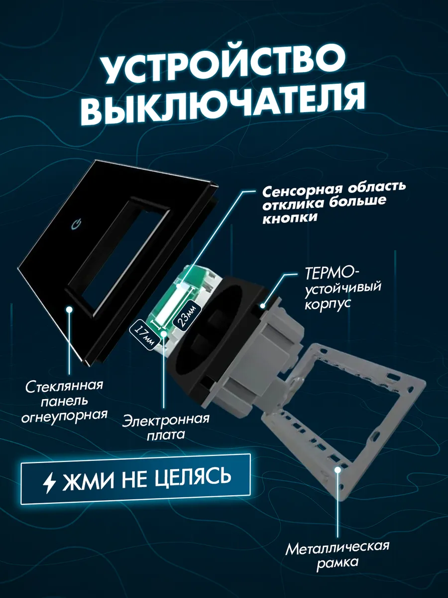 Корпус выключателя и розетки изготовлен из закаленного стекла черного цвета, что гарантирует его долговечность и устойчивость к внешним воздействиям. Использование стеклянного материала обеспечивает не только красивый внешний вид устройства, но и дополнительную защиту от повреждений. Закаленное стекло придаёт изделию прочность и долговечность, а также предотвращает появление царапин.