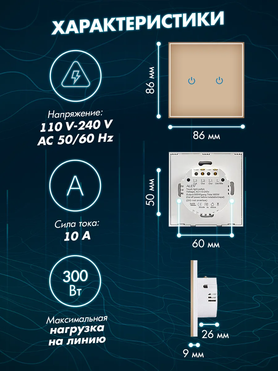 Подсветка кнопки дополнительно улучшает функциональность продукта, делая его более удобным в использовании в условиях недостаточной освещенности. Включение света происходит быстро благодаря электронному механизму с индикатором фиксации состояния светового источника. Проводное подключение гарантирует стабильную работу без перебоев и потери сигнала. Важно! После установки выключить автомат, затем установить стеклянную панель. Подождать 2-3 минуты и только потом включить автомат. Вы также можете установить данный элемент вместо традиционного переключателя благодаря его внутреннему механизму врезного типа конструкции. Благодаря своей универсальности данное изделие может использоваться как отдельный элемент интерьера.