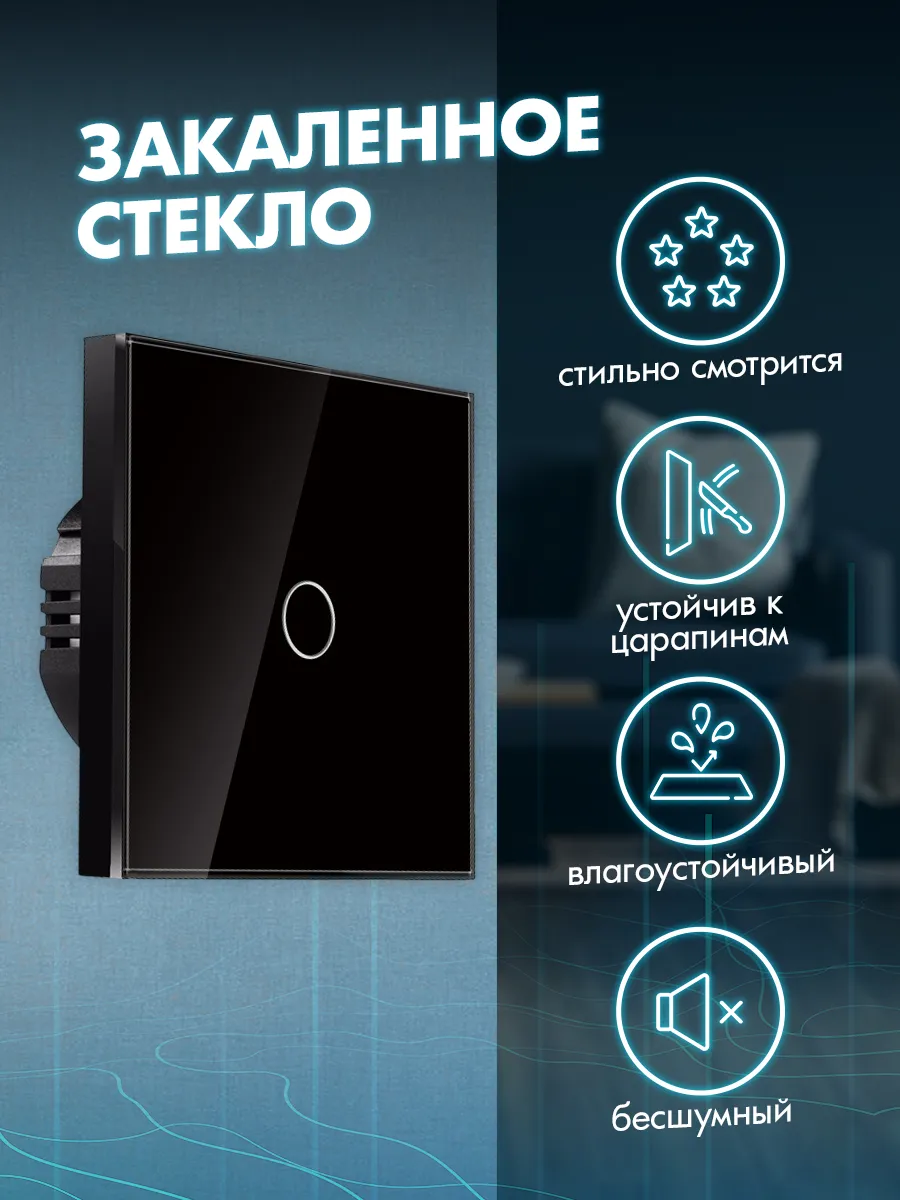 Корпус выключателя изготовлен из закаленного стекла черного цвета, что гарантирует его долговечность и устойчивость к внешним воздействиям. Использование стеклянного материала обеспечивает не только красивый внешний вид устройства, но и дополнительную защиту от повреждений. Закаленное стекло придаёт изделию огнестойкость, прочность и долговечность, а также предотвращает появление царапин.