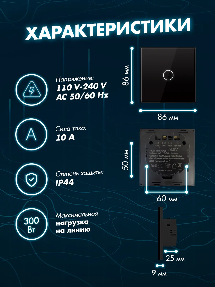 Подсветка кнопки дополнительно улучшает функциональность продукта, делая его более удобным в использовании в условиях недостаточной освещенности. Включение света происходит быстро благодаря электронному механизму с индикатором фиксации состояния светового источника. Проводное подключение гарантирует стабильную работу без перебоев и потери сигнала. Важно! После установки выключить автомат, затем установить стеклянную панель. Подождать 2-3 минуты и только потом включить автомат. Вы также можете установить данный элемент вместо традиционного переключателя благодаря его внутреннему механизму врезного типа конструкции. Благодаря своей универсальности данное изделие может использоваться как отдельный элемент интерьера.