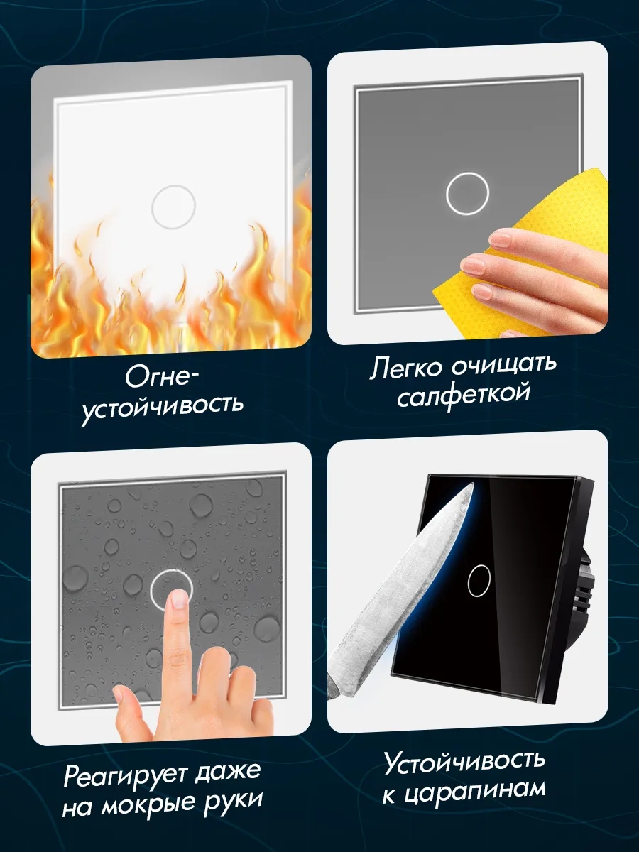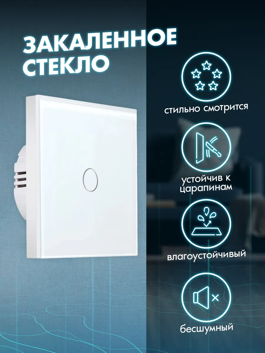 Корпус выключателя изготовлен из закаленного стекла белого цвета, что гарантирует его долговечность и устойчивость к внешним воздействиям. Использование стеклянного материала обеспечивает не только красивый внешний вид устройства, но и дополнительную защиту от повреждений. Закаленное стекло придаёт изделию огнестойкость, прочность и долговечность, а также предотвращает появление царапин.