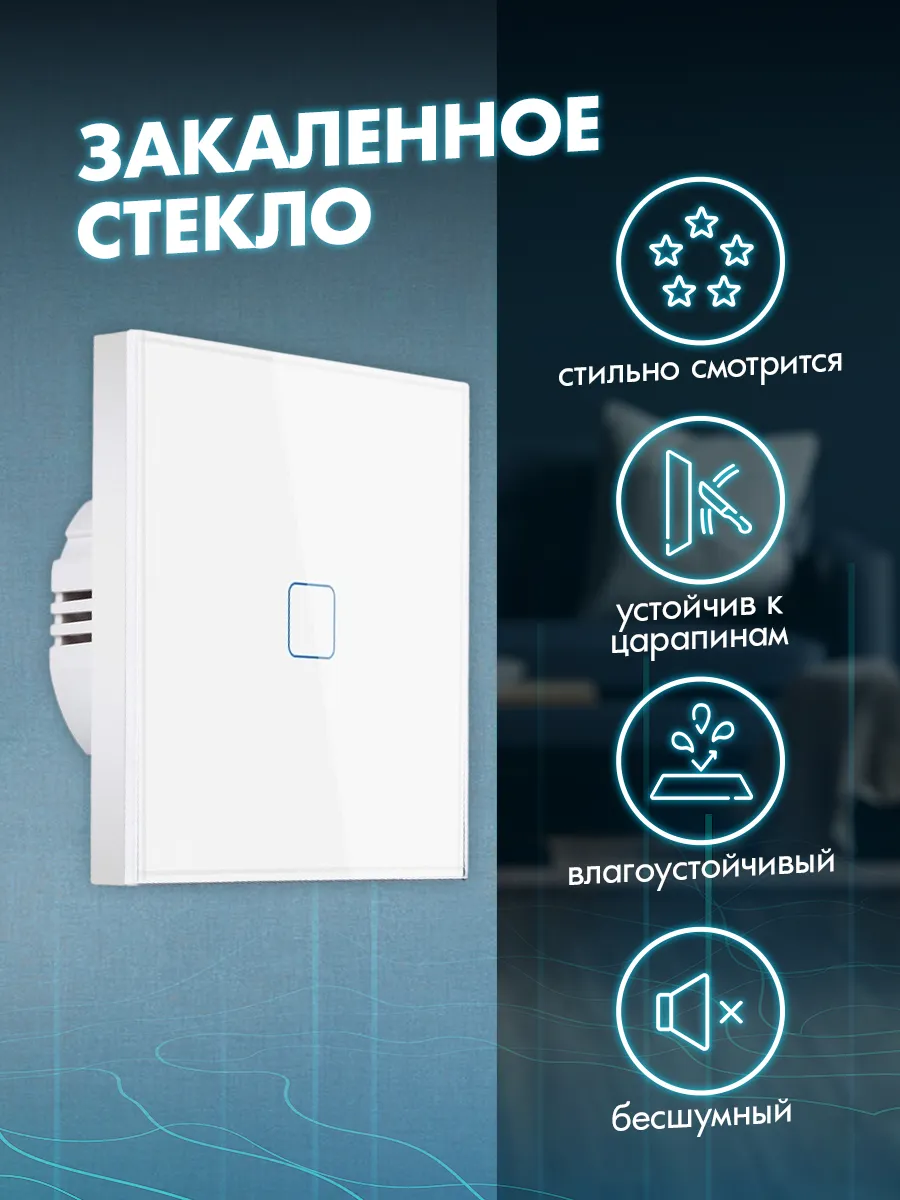 Корпус выключателя изготовлен из закаленного стекла белого цвета, что гарантирует его долговечность и устойчивость к внешним воздействиям. Использование стеклянного материала обеспечивает не только красивый внешний вид устройства, но и дополнительную защиту от повреждений. Закаленное стекло придаёт изделию огнестойкость, прочность и долговечность, а также предотвращает появление царапин.