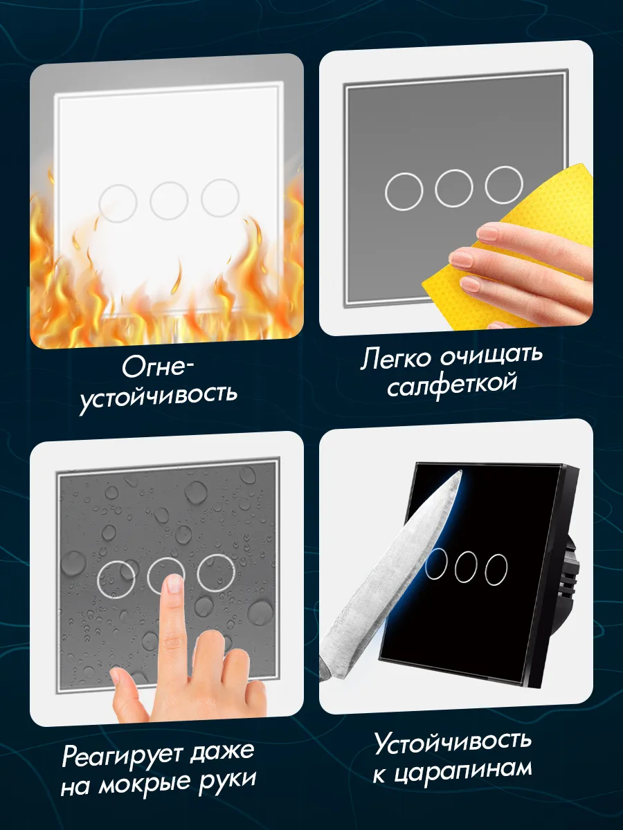 Корпус выключателя изготовлен из закаленного стекла черного цвета, что гарантирует его долговечность и устойчивость к внешним воздействиям. Использование стеклянного материала обеспечивает не только красивый внешний вид устройства, но и дополнительную защиту от повреждений. Закаленное стекло придаёт изделию прочность и долговечность, а также предотвращает появление царапин.