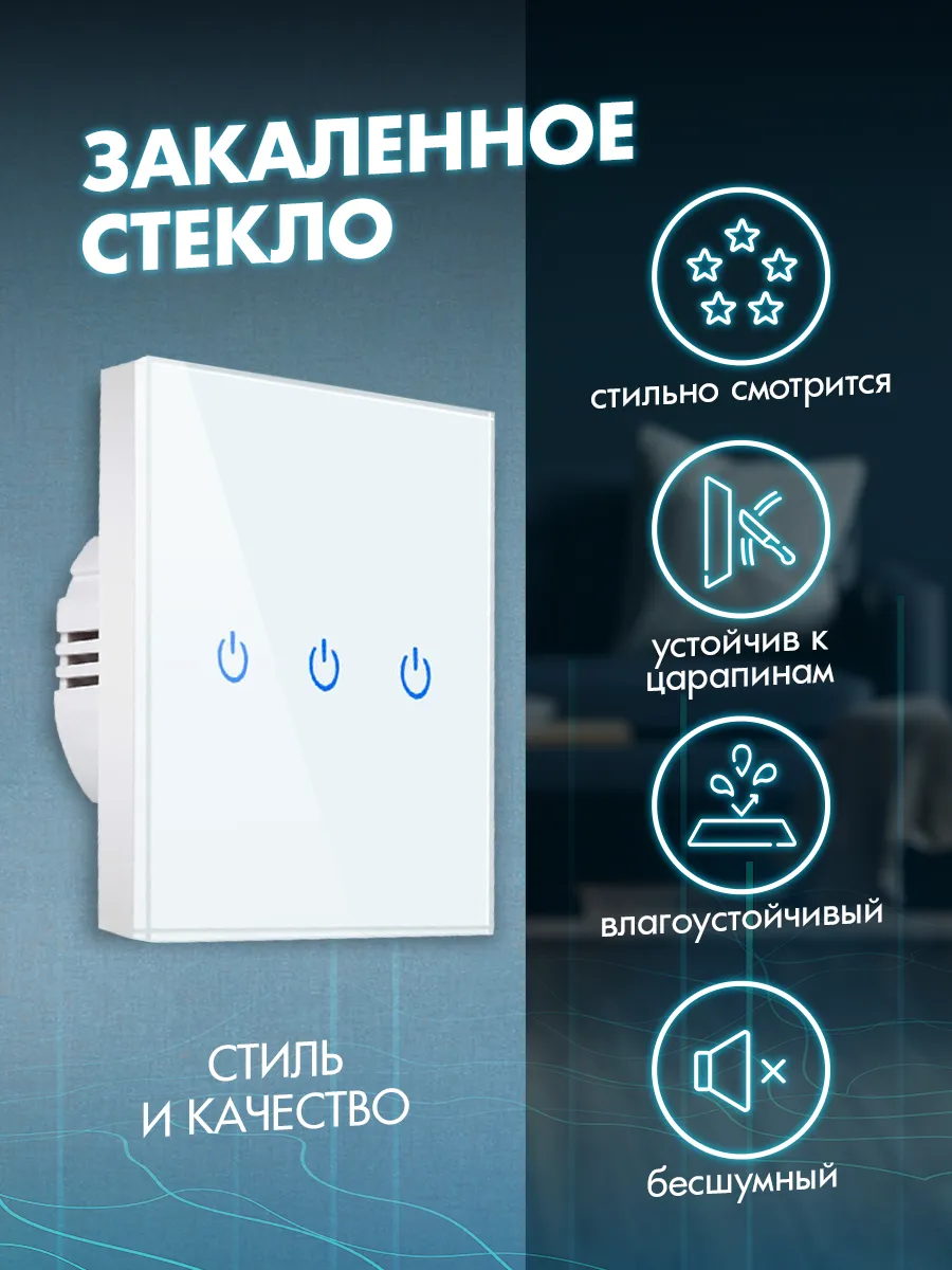 Корпус выключателя изготовлен из закаленного стекла белого цвета, что гарантирует его долговечность и устойчивость к внешним воздействиям. Использование стеклянного материала обеспечивает не только красивый внешний вид устройства, но и дополнительную защиту от повреждений. Закаленное стекло придаёт изделию прочность и долговечность, а также предотвращает появление царапин.
