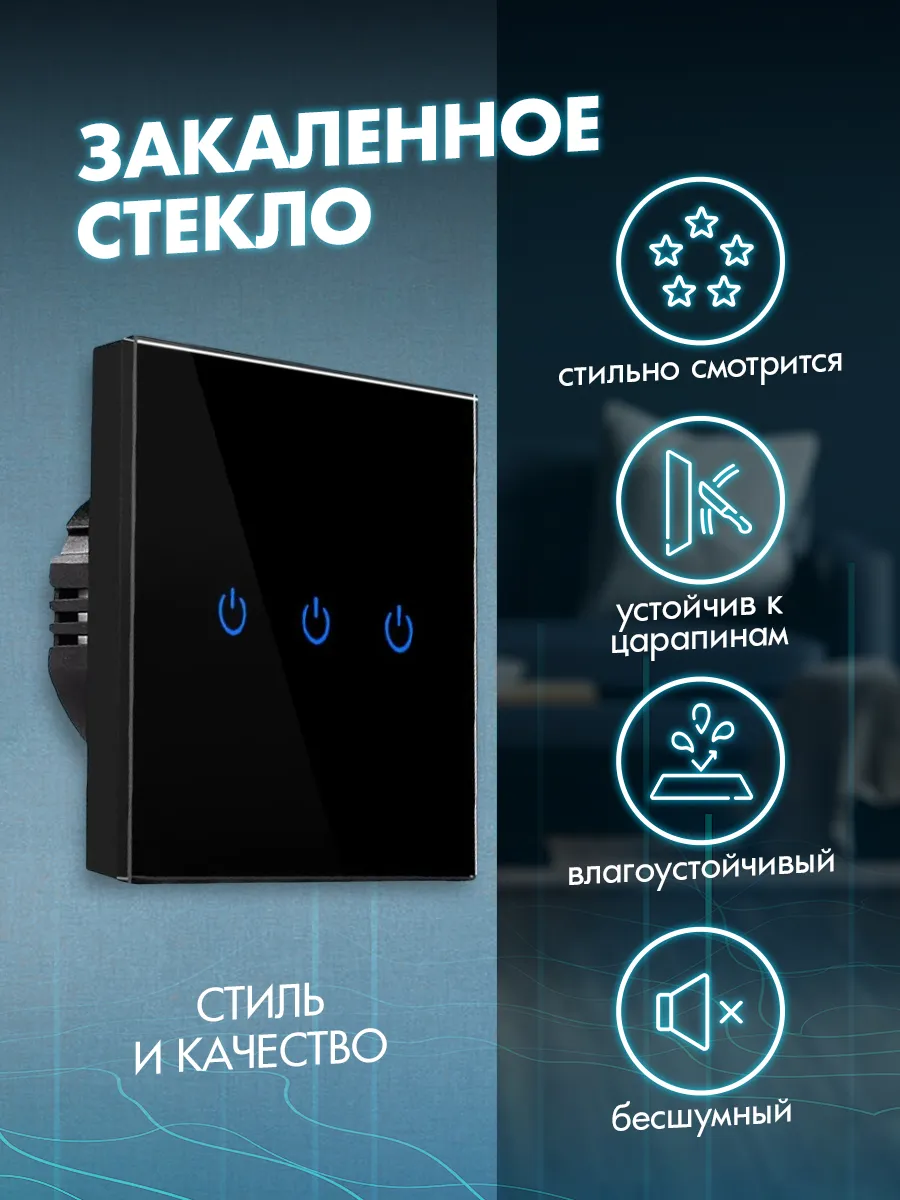 Корпус выключателя изготовлен из закаленного стекла черного цвета, что гарантирует его долговечность и устойчивость к внешним воздействиям. Использование стеклянного материала обеспечивает не только красивый внешний вид устройства, но и дополнительную защиту от повреждений. Закаленное стекло придаёт изделию прочность и долговечность, а также предотвращает появление царапин.