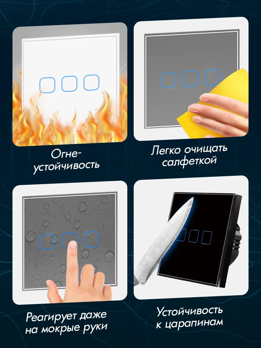 Корпус выключателя изготовлен из закаленного стекла серого цвета, что гарантирует его долговечность и устойчивость к внешним воздействиям. Использование стеклянного материала обеспечивает не только красивый внешний вид устройства, но и дополнительную защиту от повреждений. Закаленное стекло придаёт изделию прочность и долговечность, а также предотвращает появление царапин.