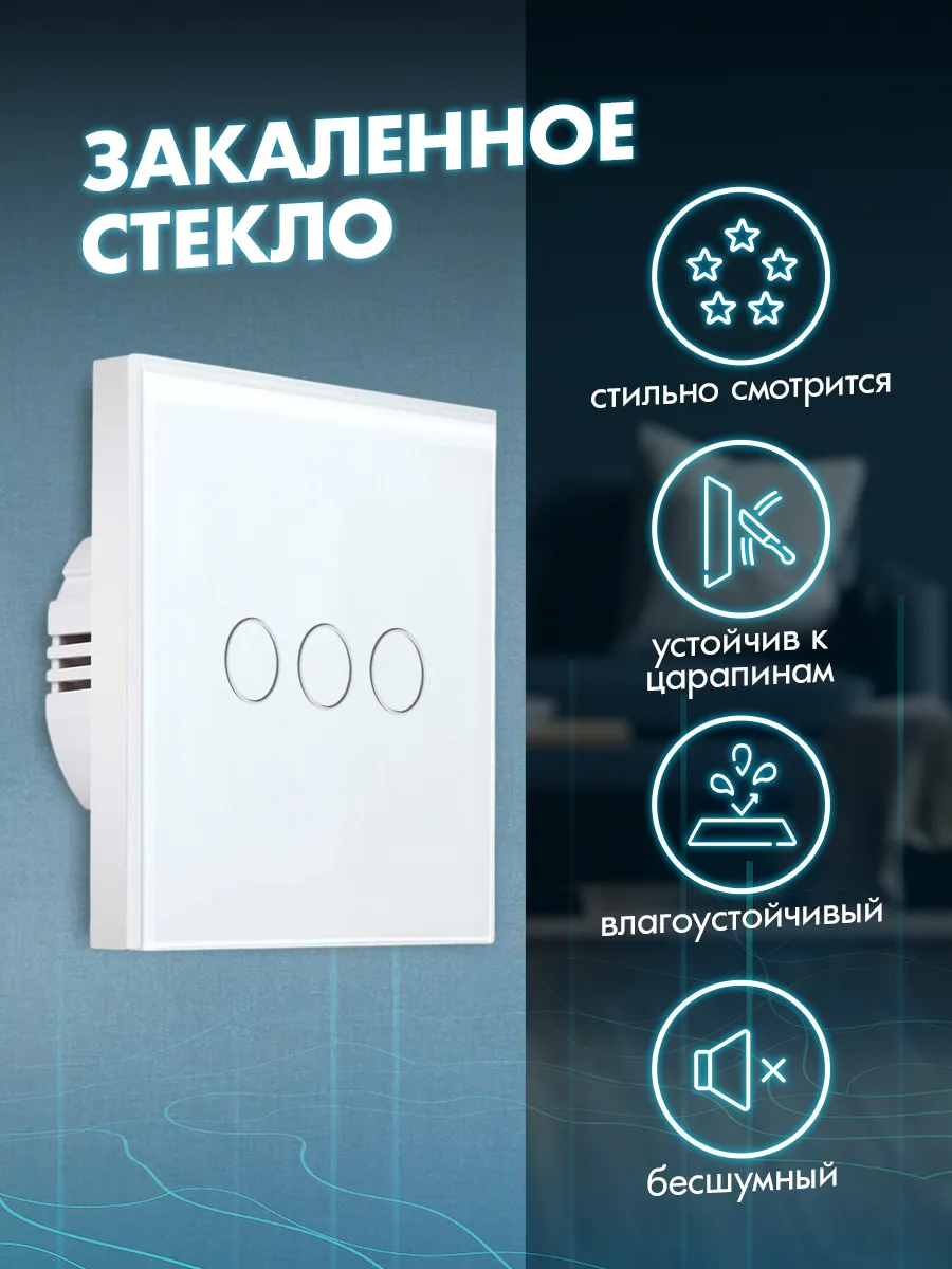 Корпус выключателя изготовлен из закаленного стекла белого цвета, что гарантирует его долговечность и устойчивость к внешним воздействиям. Использование стеклянного материала обеспечивает не только красивый внешний вид устройства, но и дополнительную защиту от повреждений. Закаленное стекло придаёт изделию прочность и долговечность, а также предотвращает появление царапин.